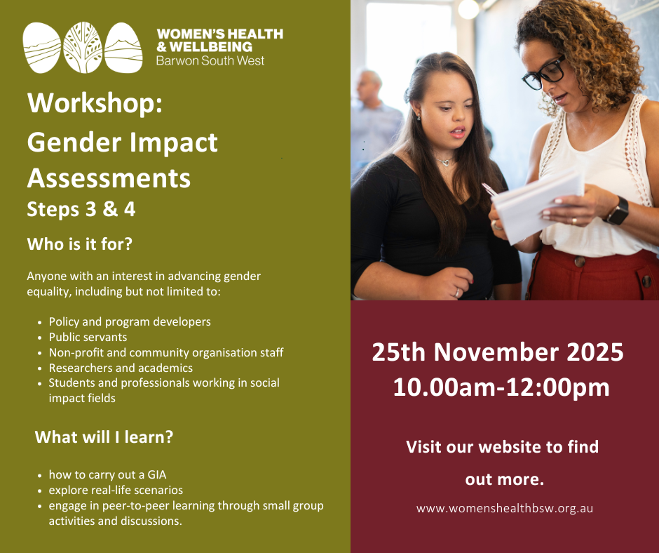Join Women’s Health and Wellbeing Barwon South West as we walk you through a practical and user friendly guide to undertaking Gender Impact Assessments (GIA’s).